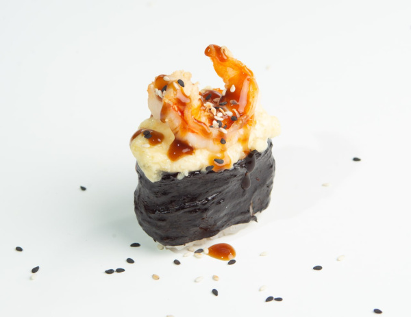 Рис, нори, шапка:сырный замес, креветка, соус унаги, кунжут