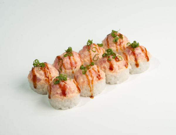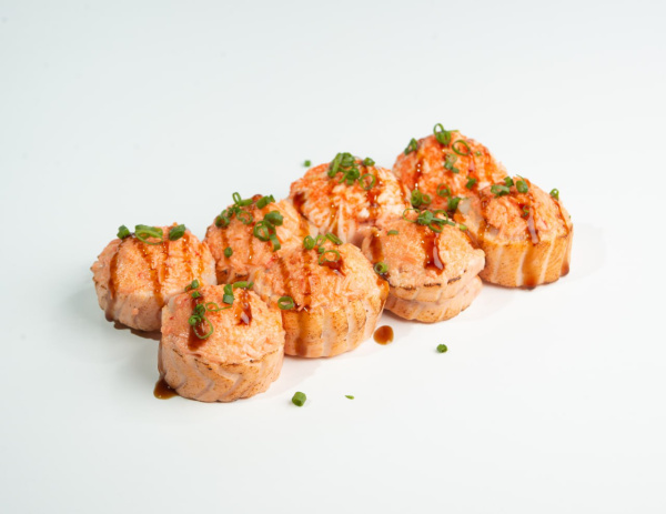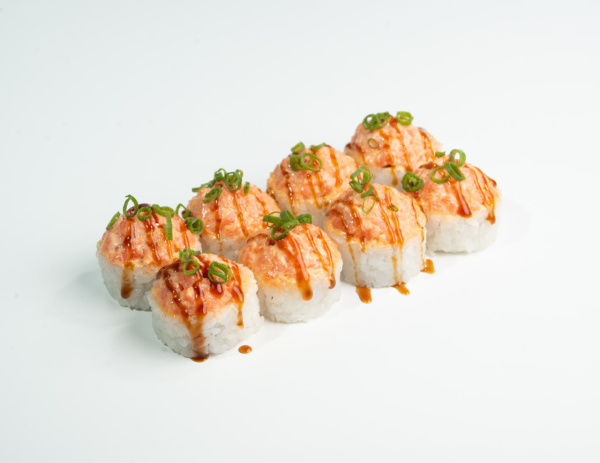 Футомаки с копчёным лососем,зелёным луком, спайси и луком фри (8шт)