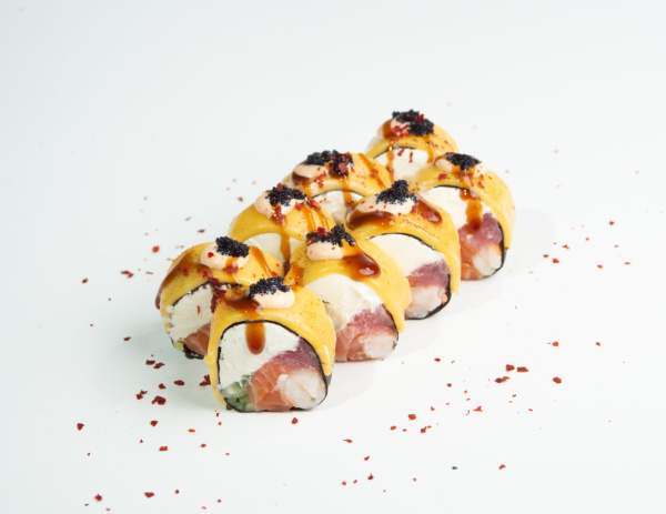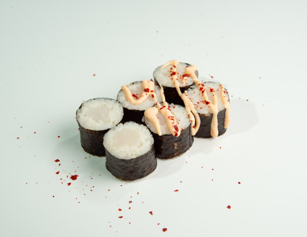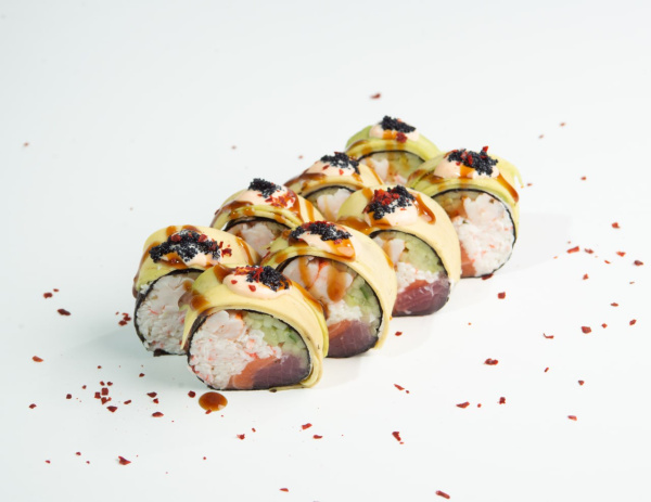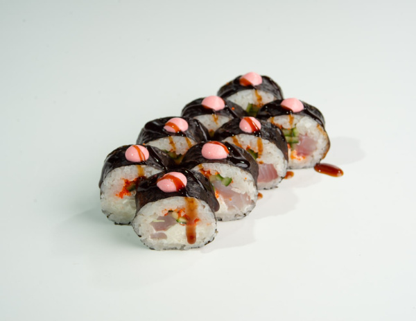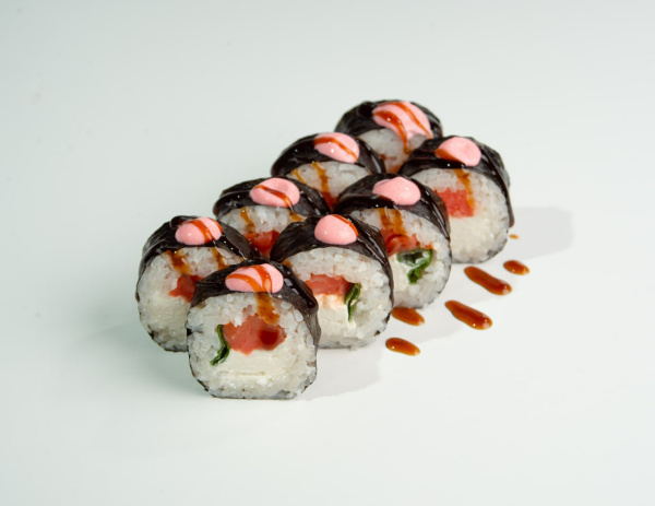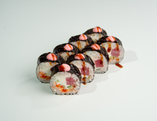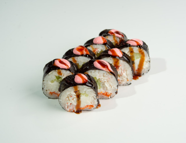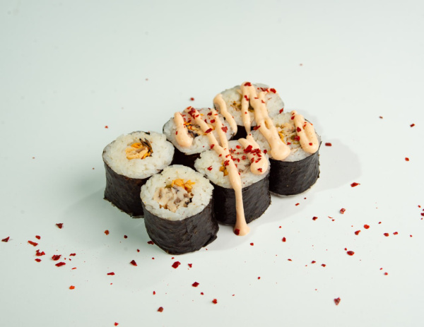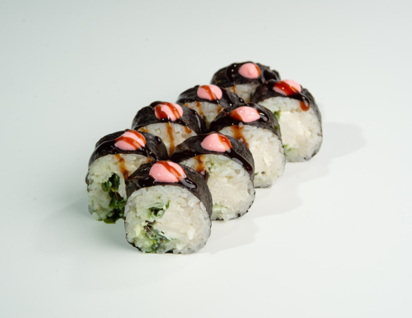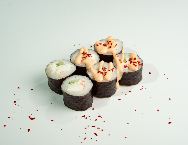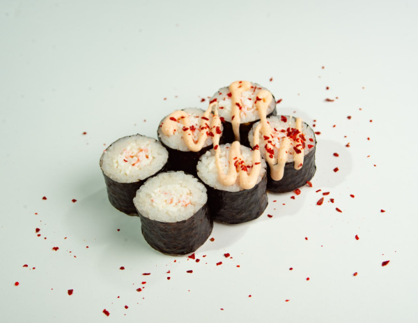 Рис, нори, творожный сыр, огурец, волокна снежного краба, соус спайси, чёрная икра тобико, нити чили