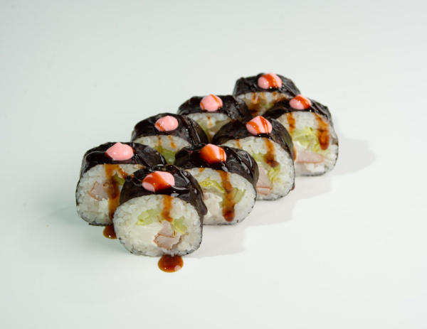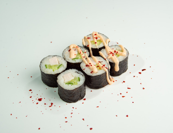 Рис, нори, творожный сыр, огурец, копчёная курица, соус спайси, чёрная икра тобико, нити чили
