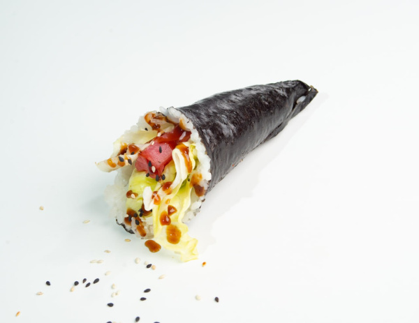 Рис, нори, тунец, лист салата, огурец, творожный сыр, соус унаги, кунжут