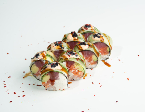 Рис, нори, творожный сыр, огурец, копчёный лосось, соус спайси, чёрная икра тобико, нити чили