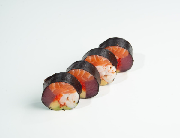 Рис, нори, сыр творожный, лосось, тунец, икра тобико, авокадо