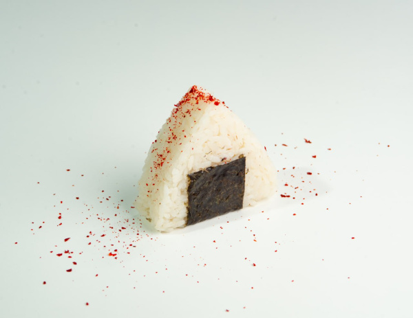 Рис, копчёный лосось, соус спайси, зелёный лук, посыпка чили