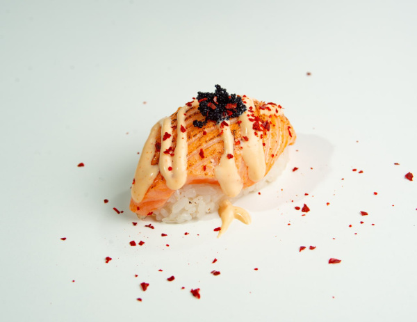 Рис, опаленный лосось, соус спайси, чёрная икра тобико , посыпка чили