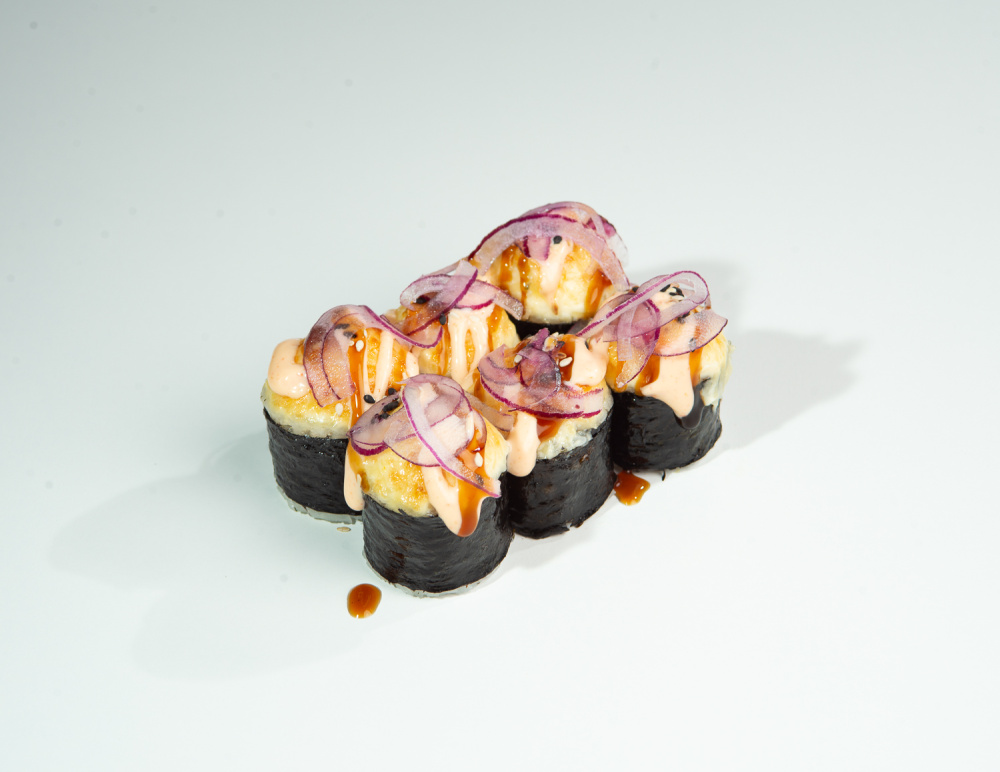 Рис, нори, копчёная курица, творожный сыр, огурец, лук фри, шапка: сырный замес, соус унаги, кунжут