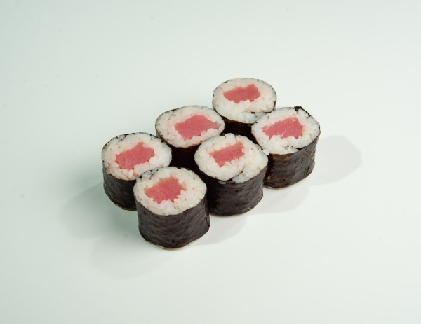 Рис, нори, тунец, лист салата, огурец, творожный сыр, соус унаги, кунжут
