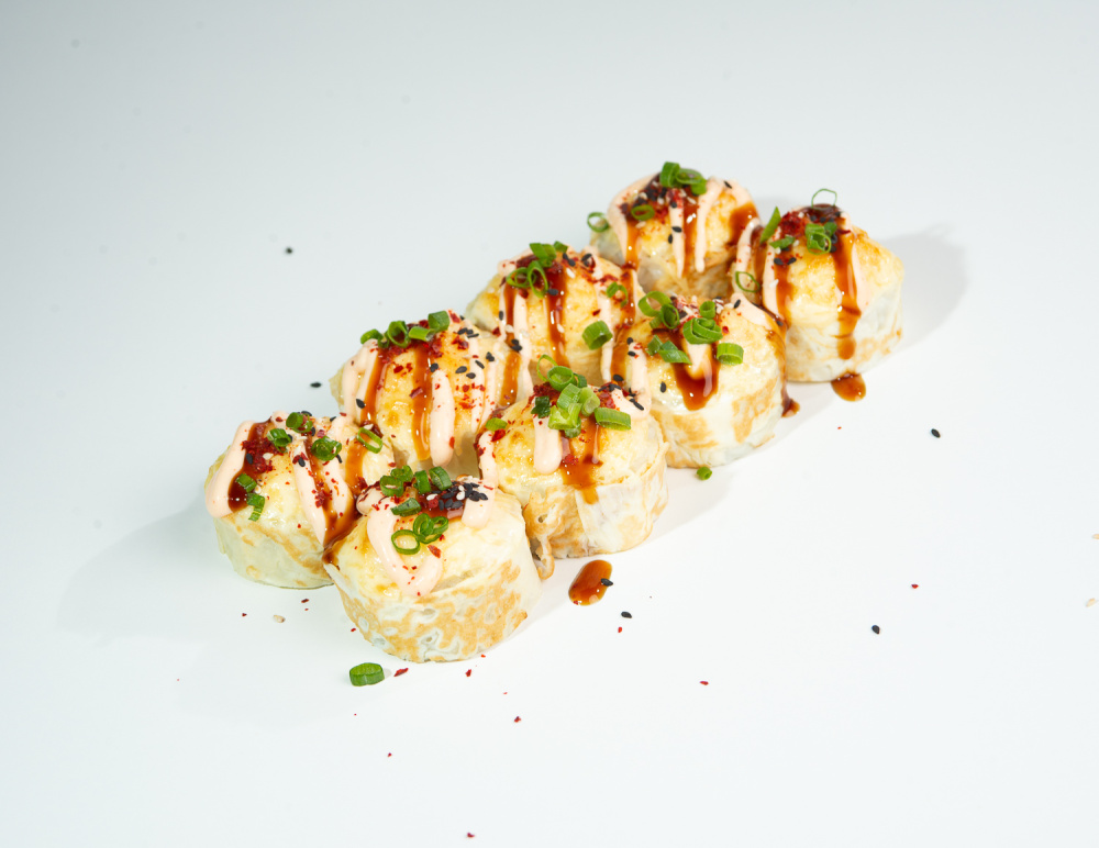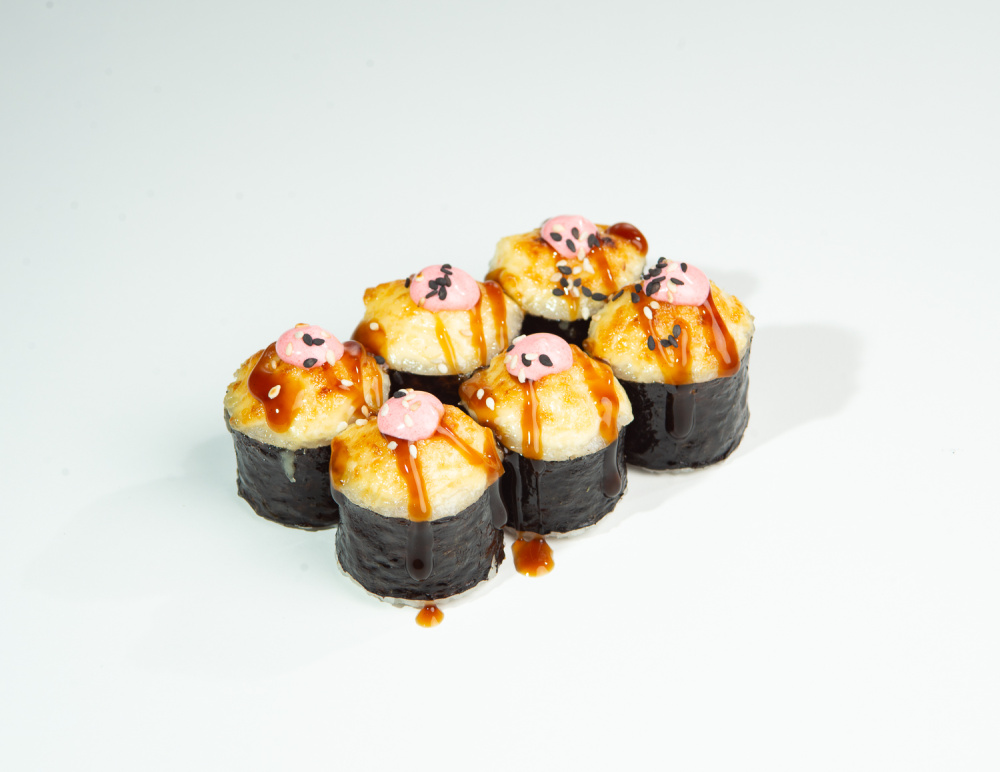 8.(8 шт)Запечённый ролл с помидором, сыром,зелёным луком и соусом унаги