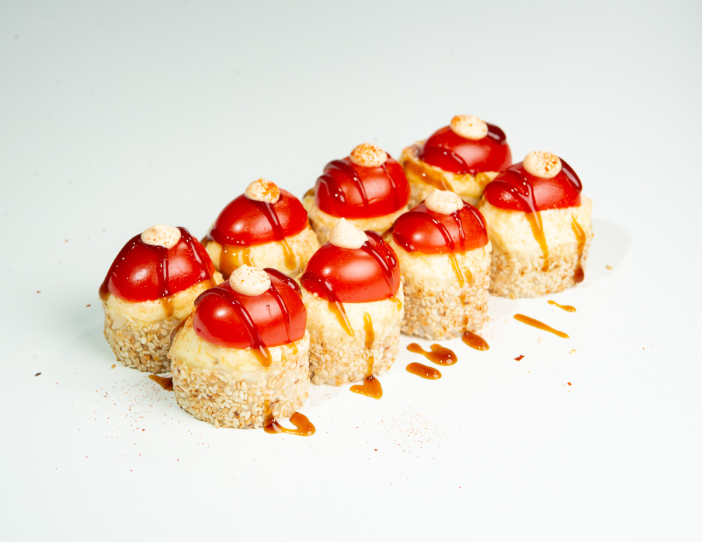 Рис, нори, помидор, творожный сыр, зелёный лук, шапка: сырный замес, соус унаги, кунжут