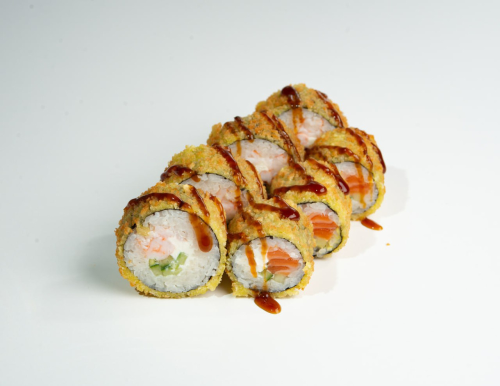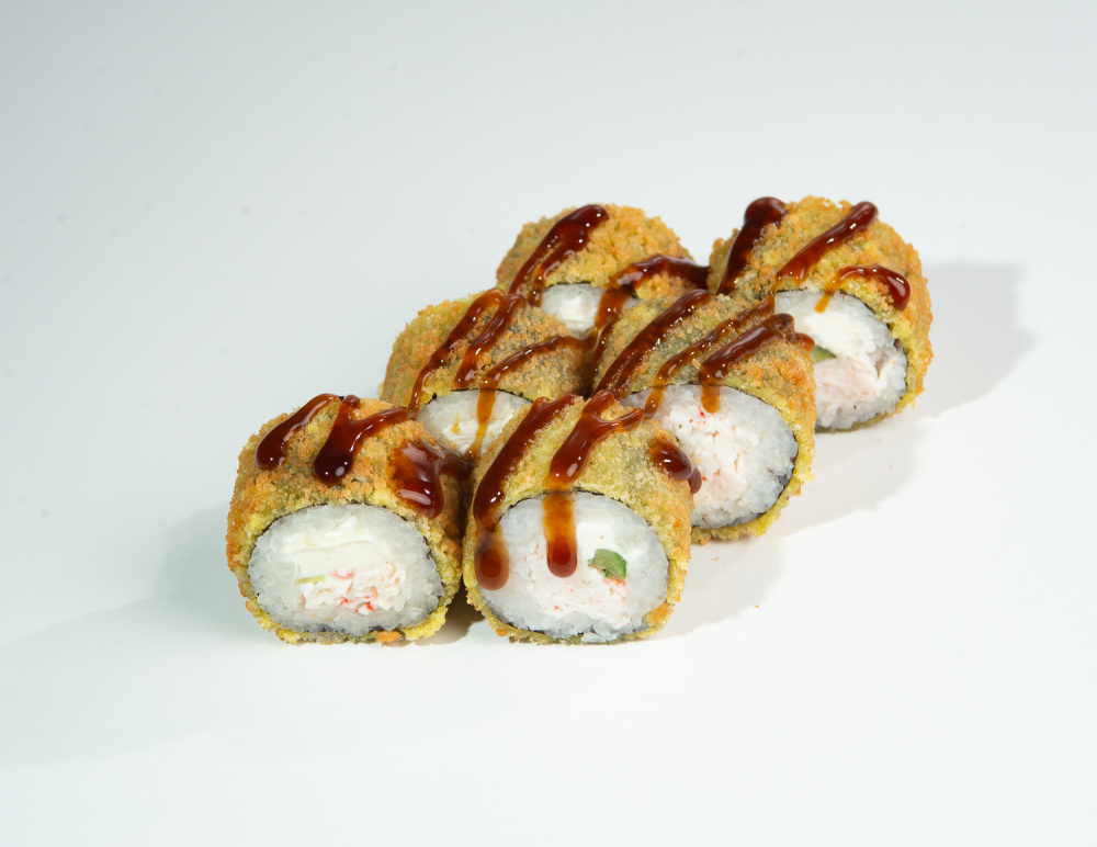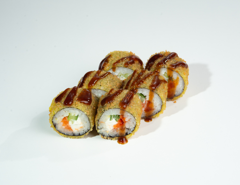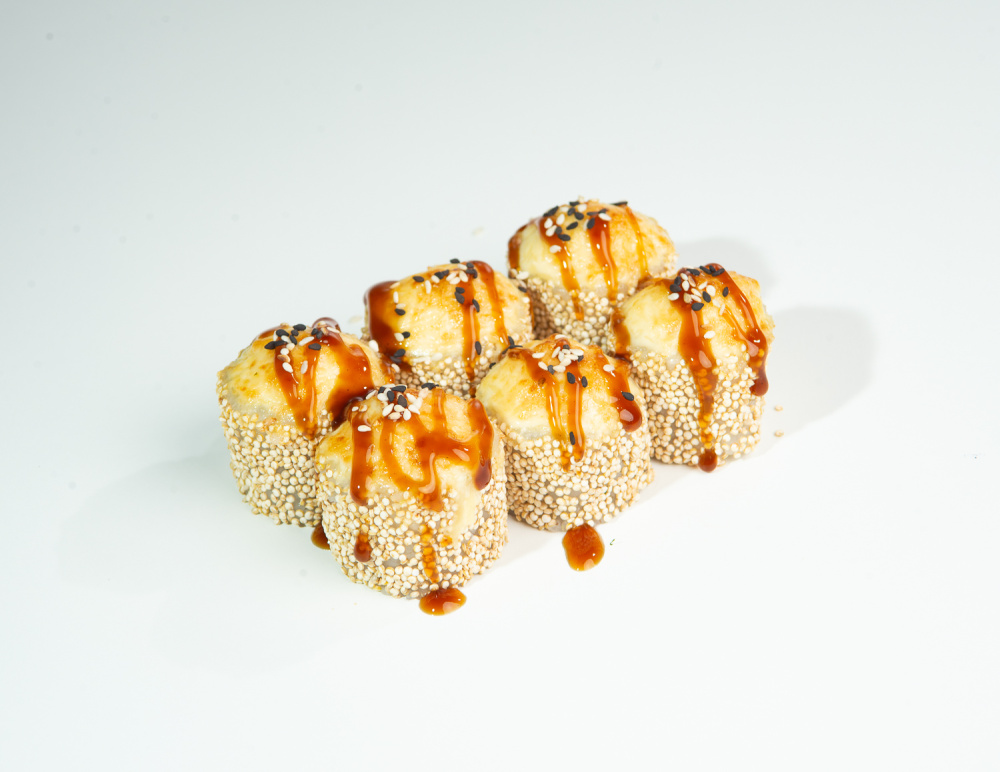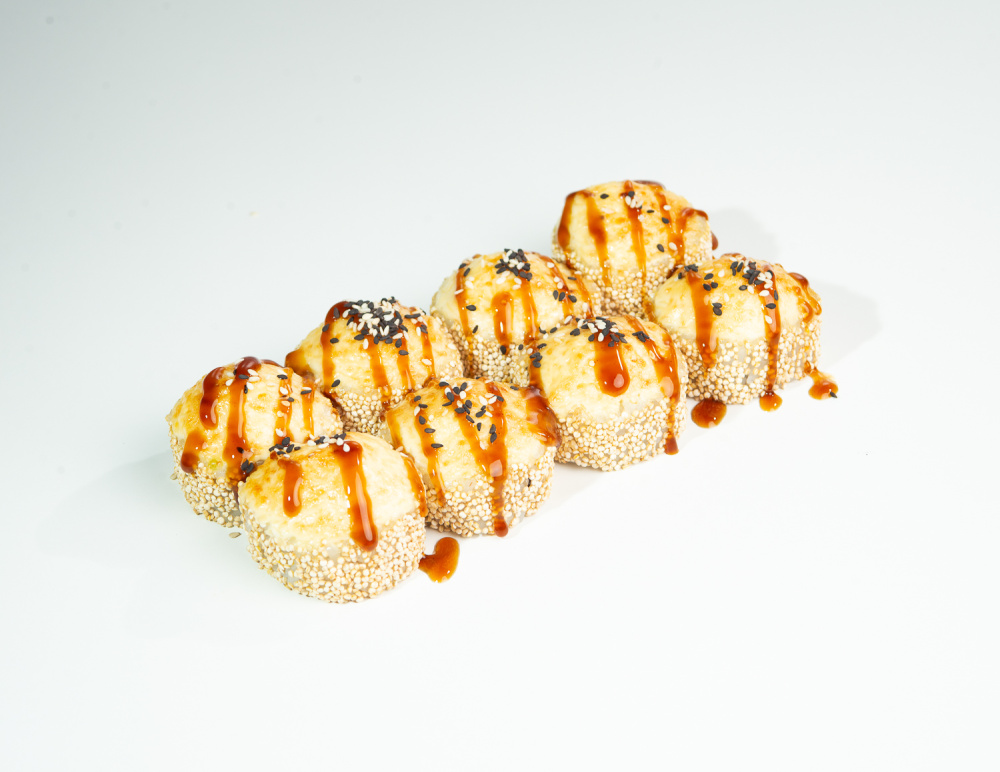 Рис, творожный сыр, лосось, кляр, сухари панко, соус унаги, кунжут
