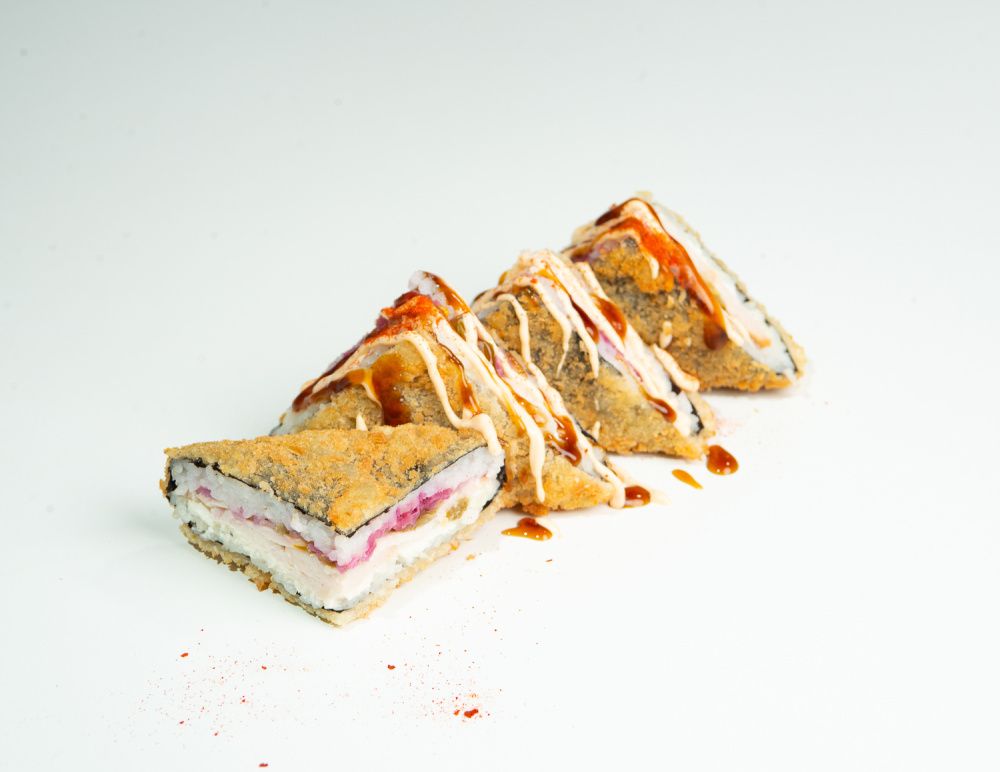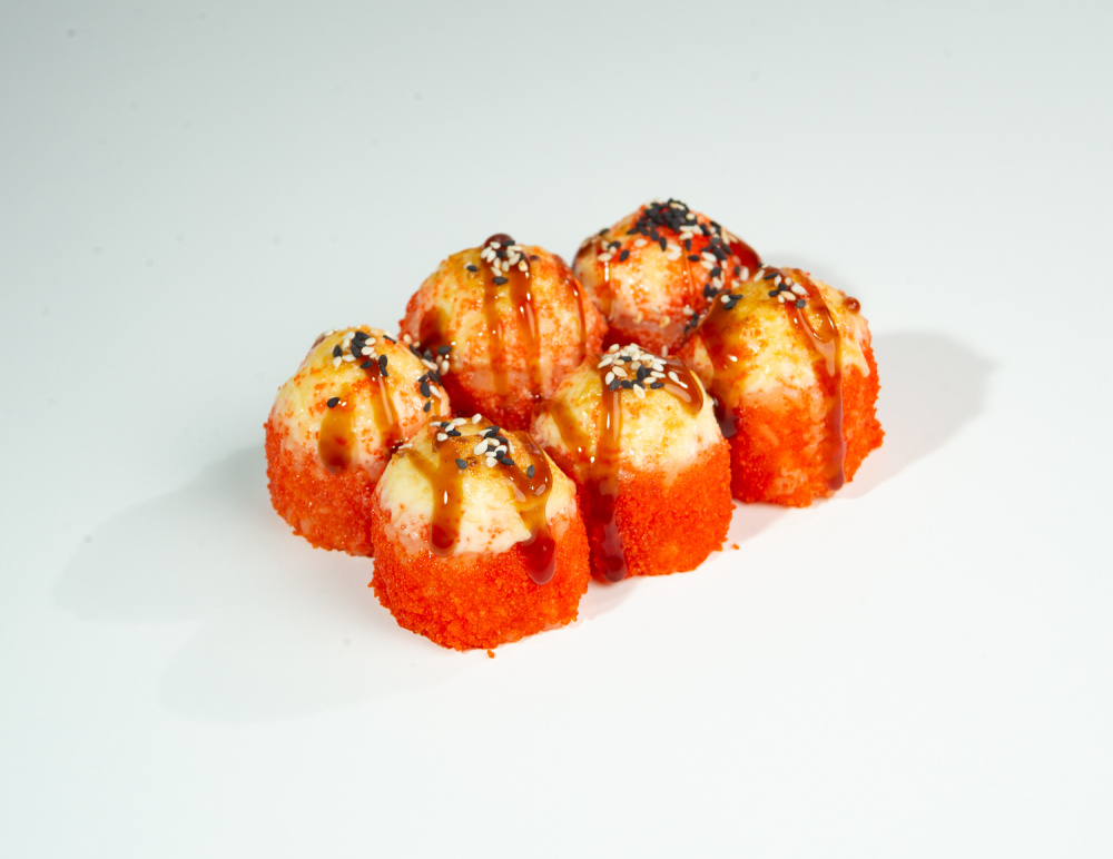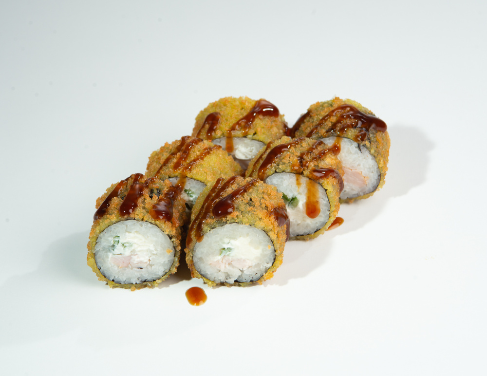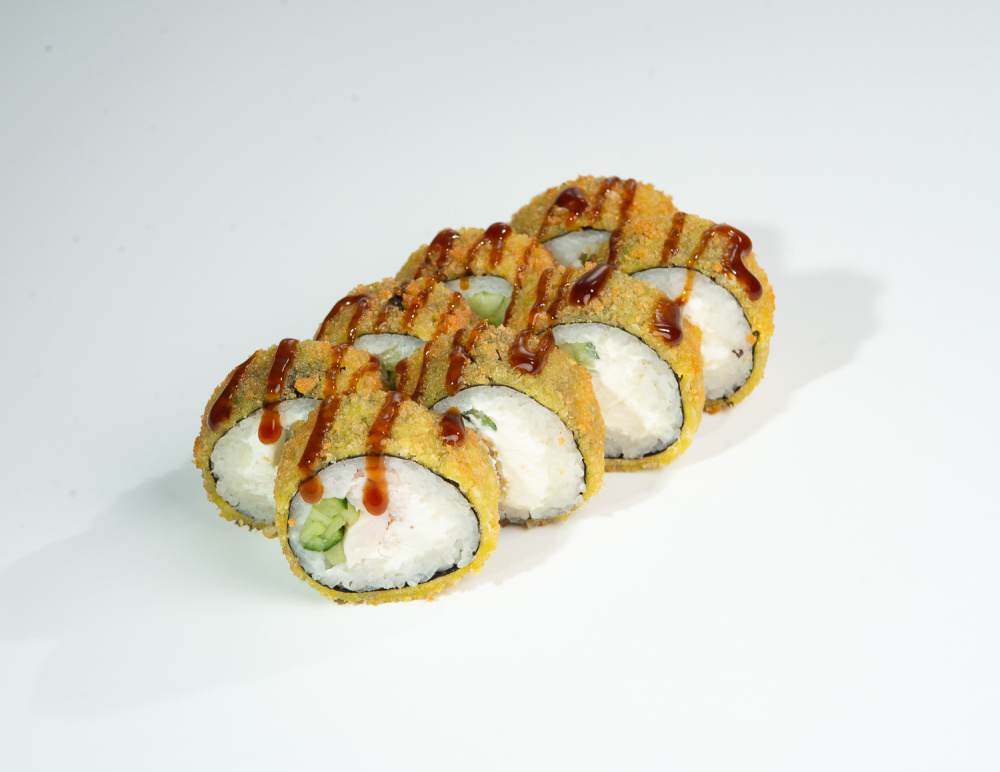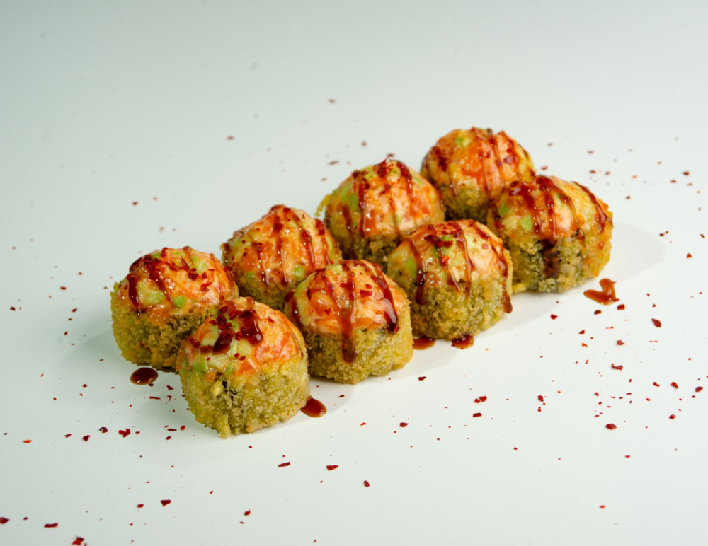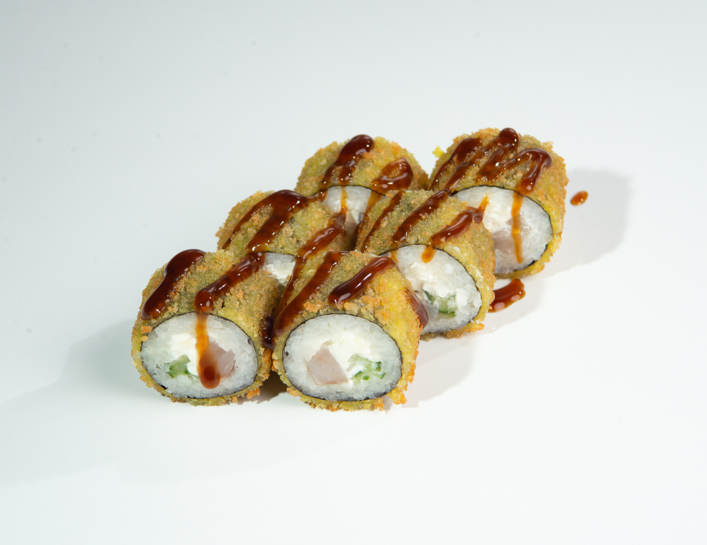 Рис, творожный сыр, лосось, кляр, сухари панко, соус унаги, кунжут