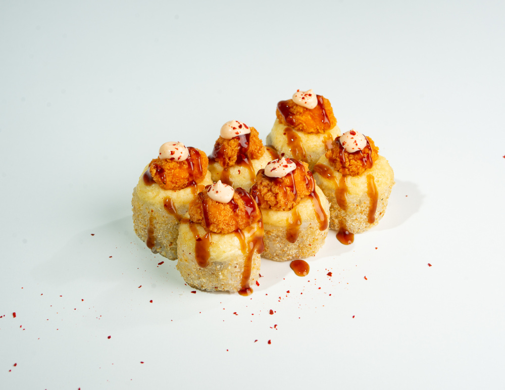 Рис, нори, копчёная курица, творожный сыр, огурец, шапка: сырный замес, соус спайси, соус табаско, посыпка чили