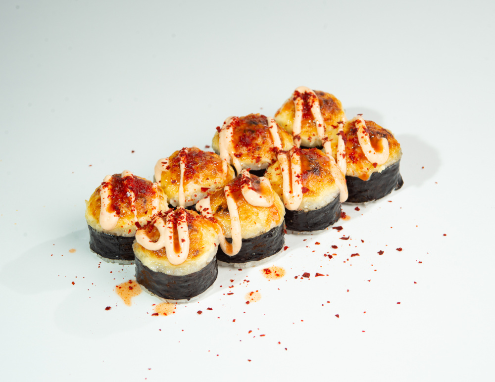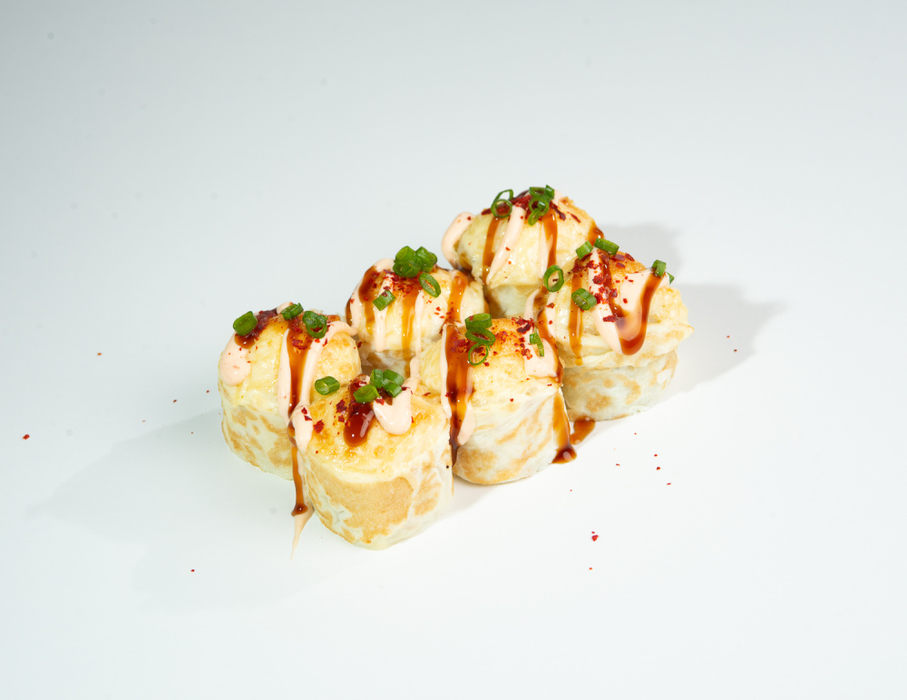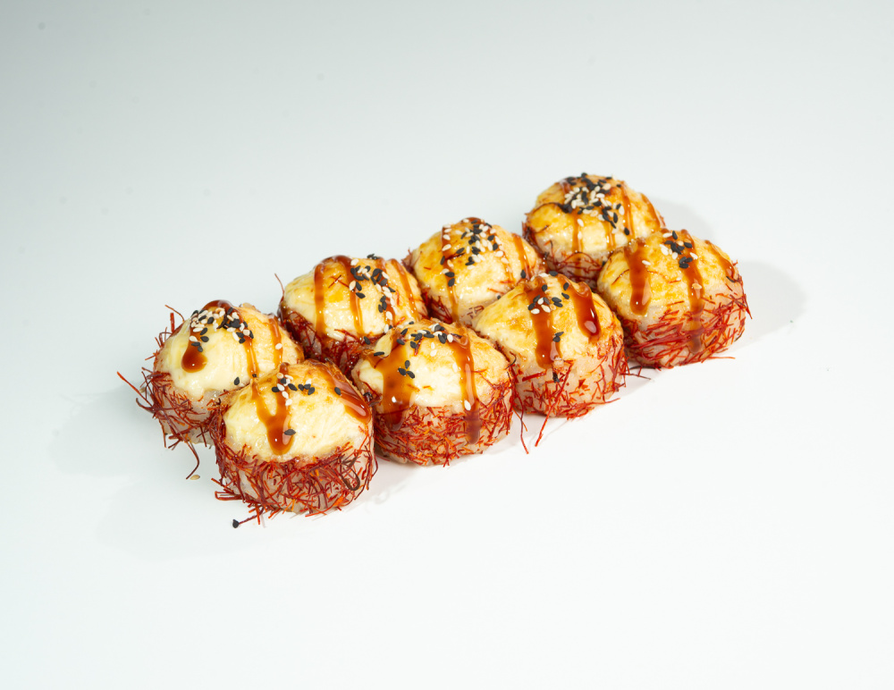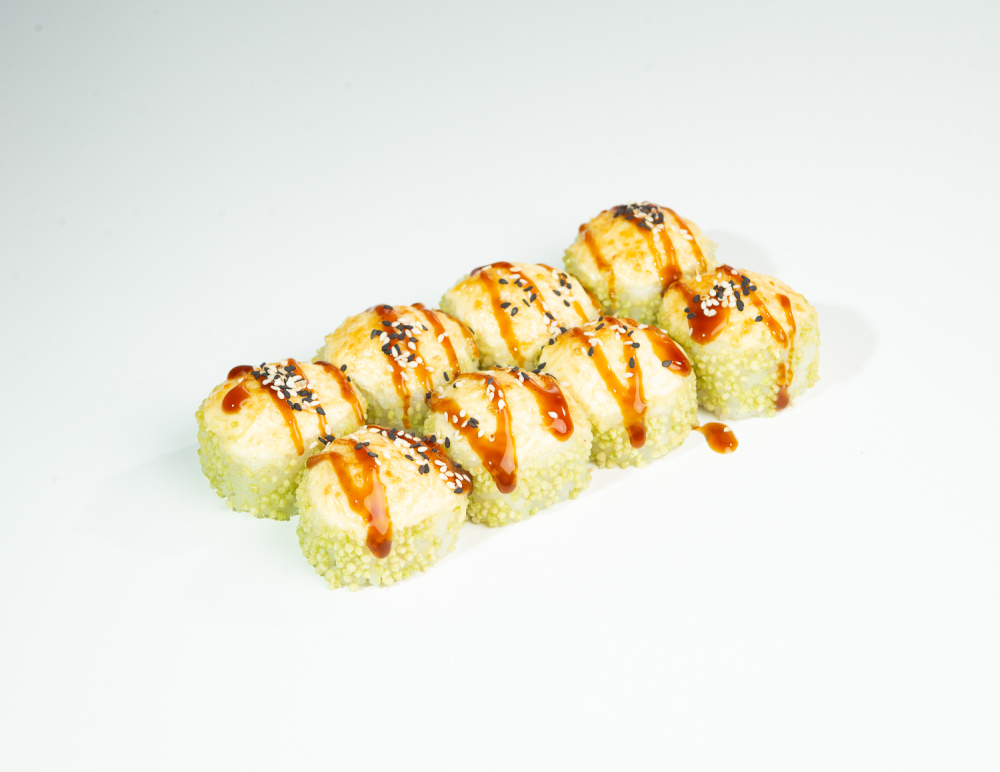 Рис, нори, омлет, творожный сыр, икра тобико, шапка: сырный замес, соус унаги, кунжут