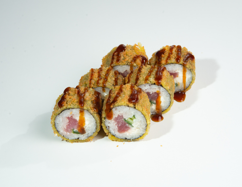 Рис, нори, тунец, огурец, волокна снежного краба, икра тобико, соус спайси, соус унаги, посыпка чили