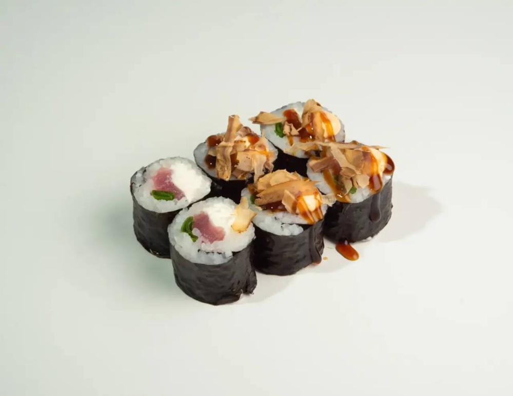 Нори, волокна снежного краба, креветка, огурец, творожный сыр, опаленный тунец, соус спайси, зелёный лук