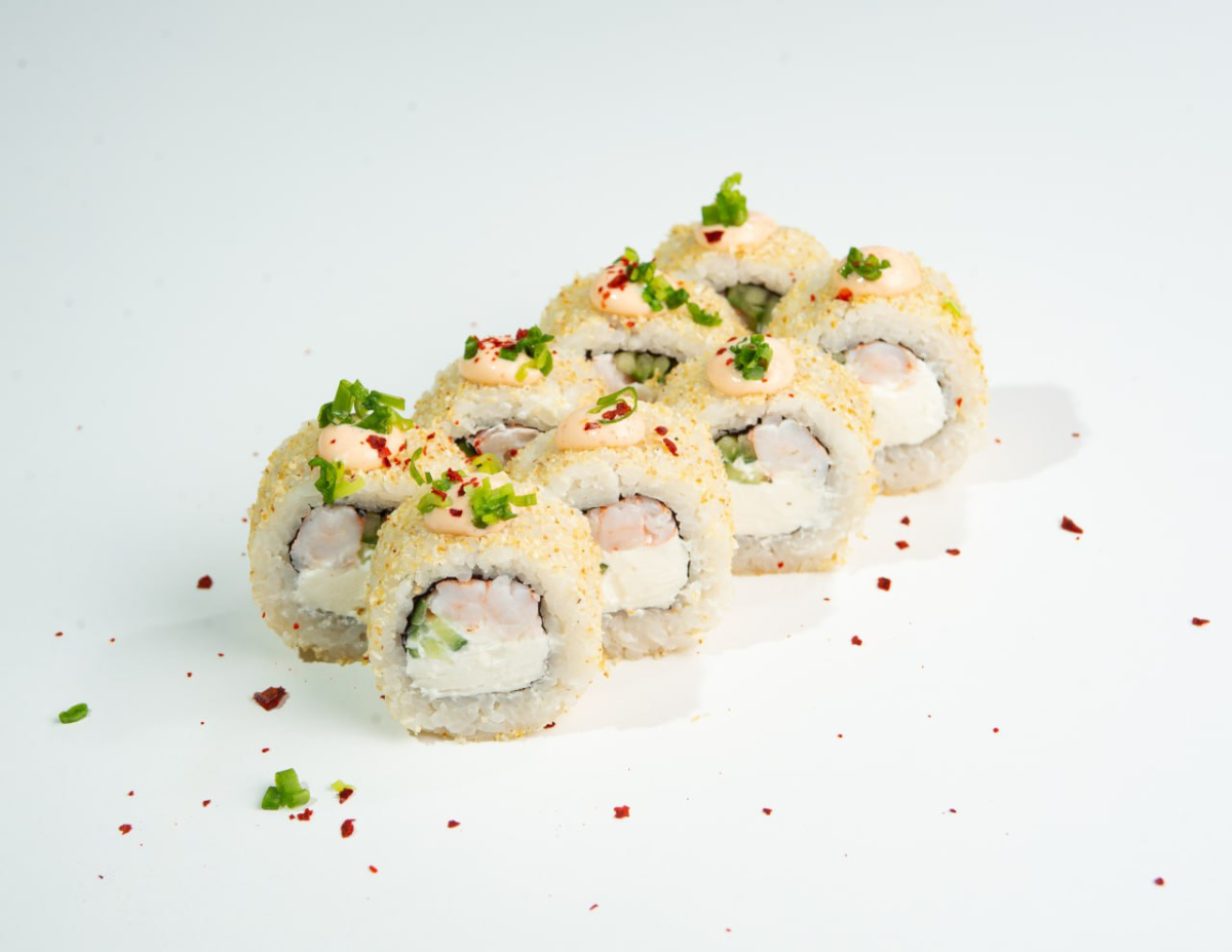Рис, нори, креветка, огурец, творожный сыр, чеснок сухой, соус спайси, зелёный лук, посыпка чили