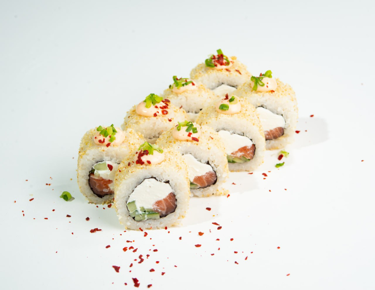 Рис, нори, лосось, огурец, творожный сыр, чеснок сухой, соус спайси, зелёный лук, посыпка чили