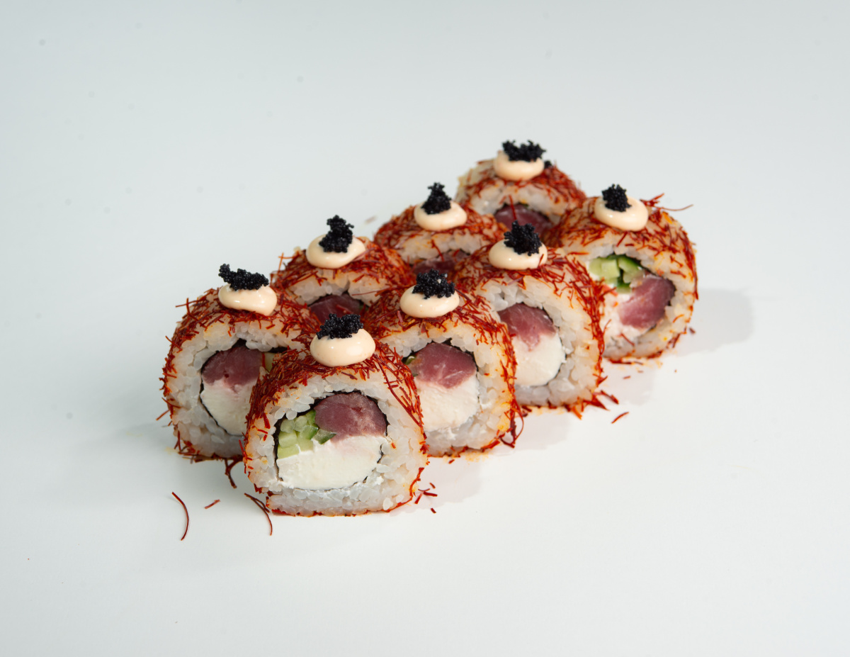 Рис, нори, творожный сыр, огурец, тунец, нити чили, соус спайси, чёрная икра тобико