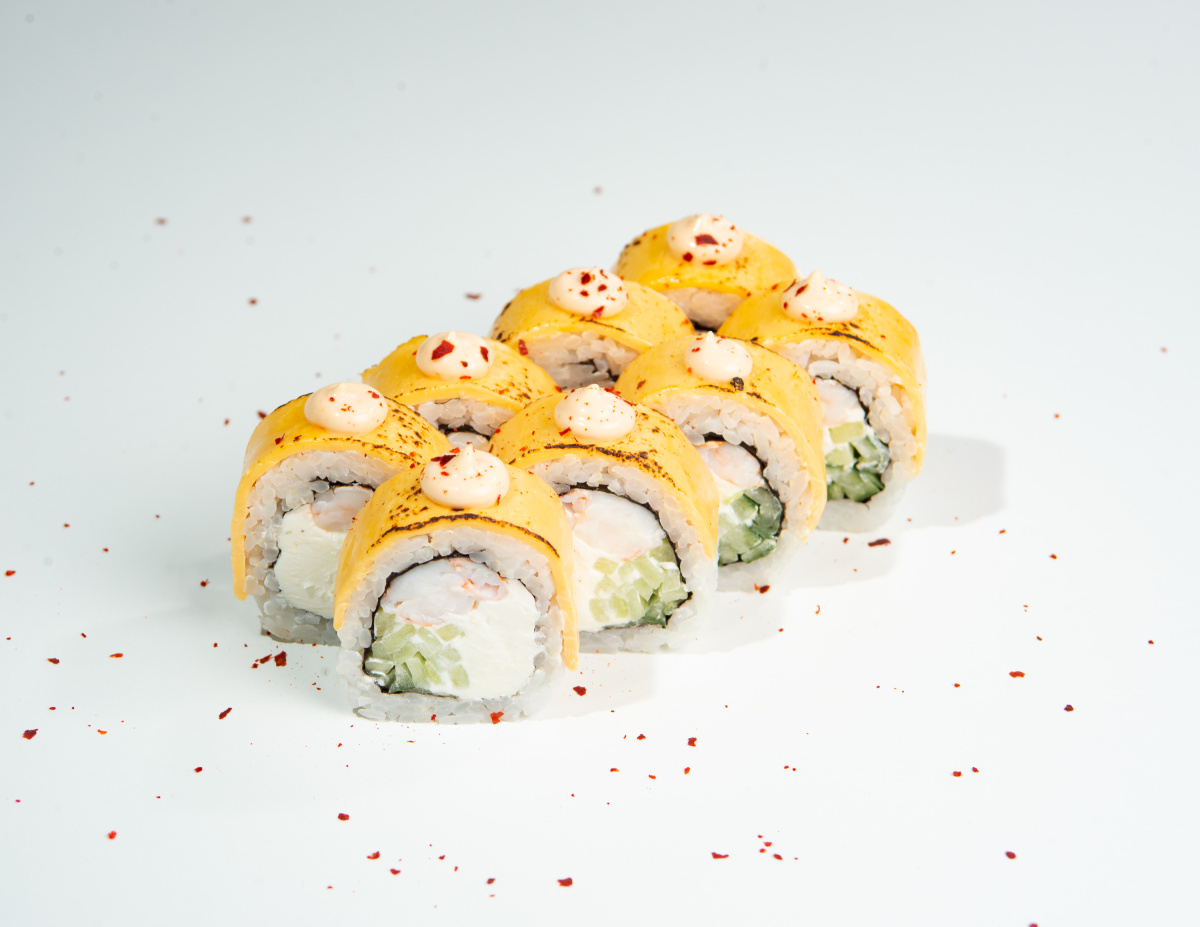 Рис, нори, творожный сыр, огурец, креветка, сыр чеддер, соус спайси, посыпка чили