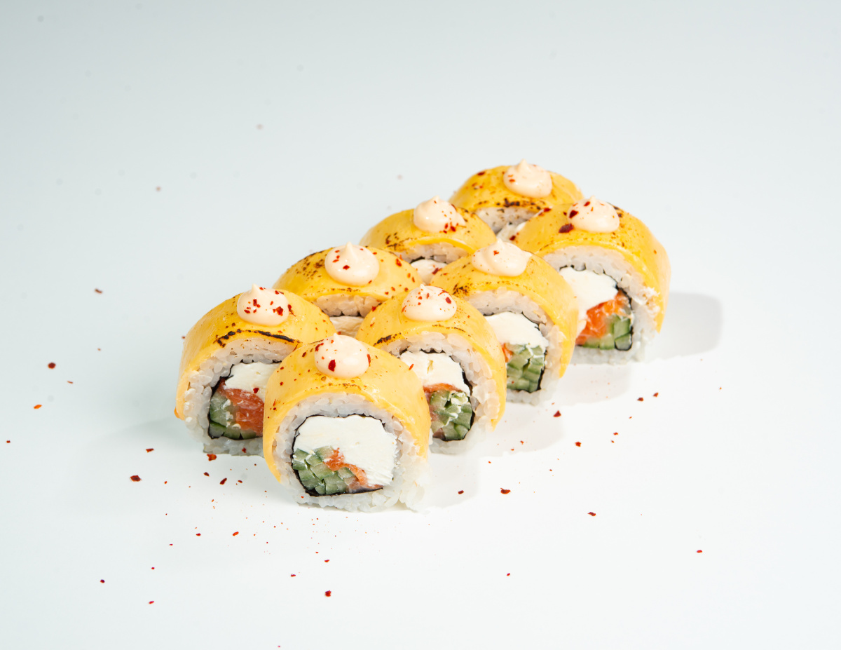 Рис, нори, творожный сыр, огурец, лосось, сыр чеддер, соус спайси, посыпка чили