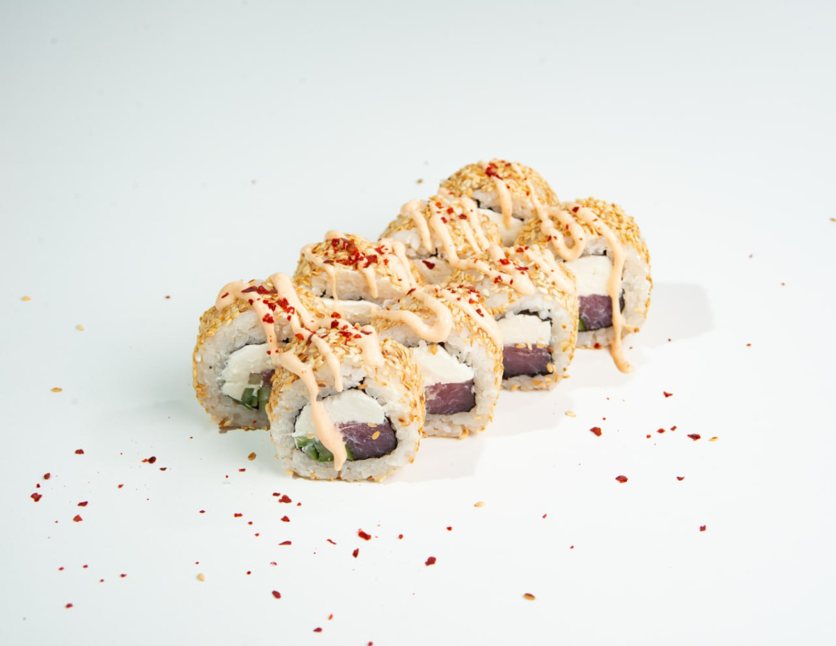 Рис, нори, тунец, творожный сыр, огурец, кунжут, соус спайси, посыпка чили