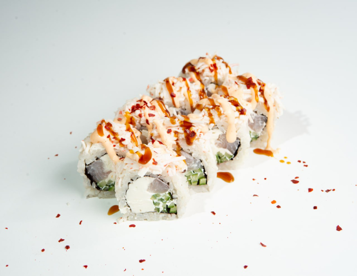 Рис, нори, творожный сыр, огурец, морской окунь, волокна снежного краба, соус унаги, соус спайси, посыпка чили