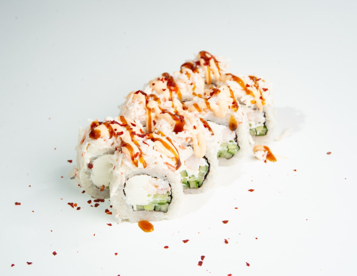 Рис, нори, творожный сыр, огурец, креветка, волокна снежного краба, соус унаги, соус спайси, посыпка чили