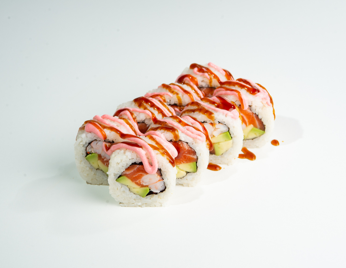 Рис, нори, лосось, авокадо, креветки, соус унаги, соус лава