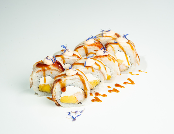 Рис, нори, угорь, манго, креветки темпура, творожный сыр, соус унаги, соус спайси, *сухие васильки