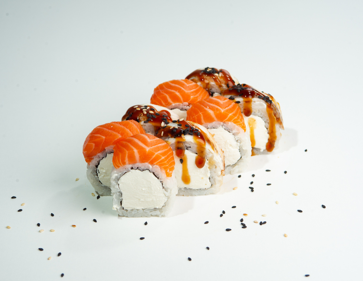 Рис, нори, творожный сыр, угорь, лосось, соус унаги, кунжут