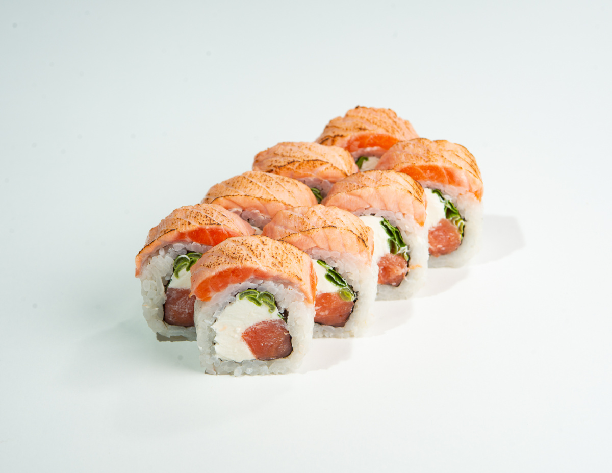 - Опалённая Филадельфия с копчёным лососем, луком (8шт)