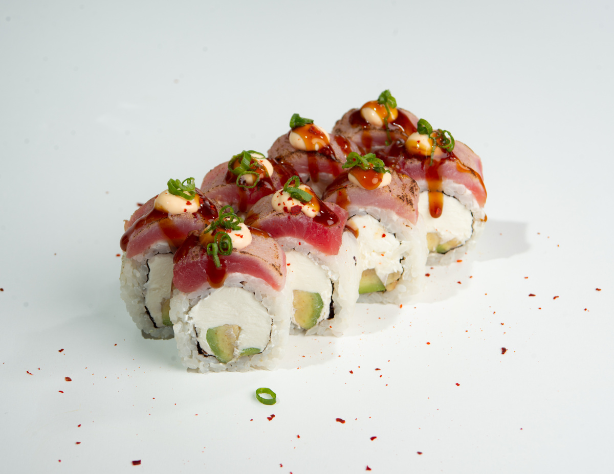 Рис, нори, творожный сыр, авокадо, тунец, соус унаги, соус спайси, посыпка чили зелёный лук