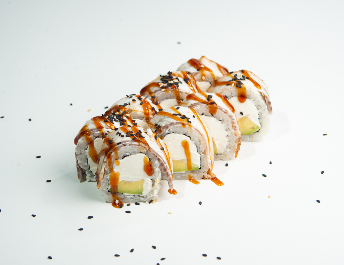 Рис, нори, творожный сыр, авокадо, угорь, соус унаги, кунжут