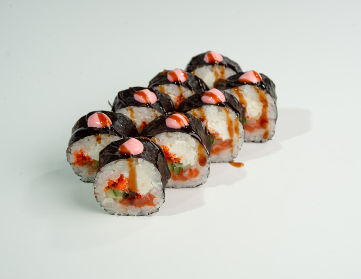 Рис, нори, творожный сыр, лосось, икра тобико, огурец, соус лава, соус унаги