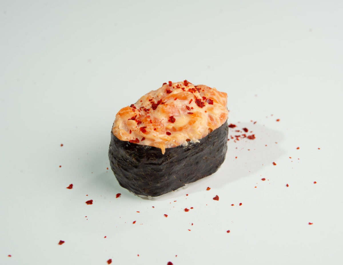 Рис, нори, копчёный лосось, соус спайси, посыпка чили