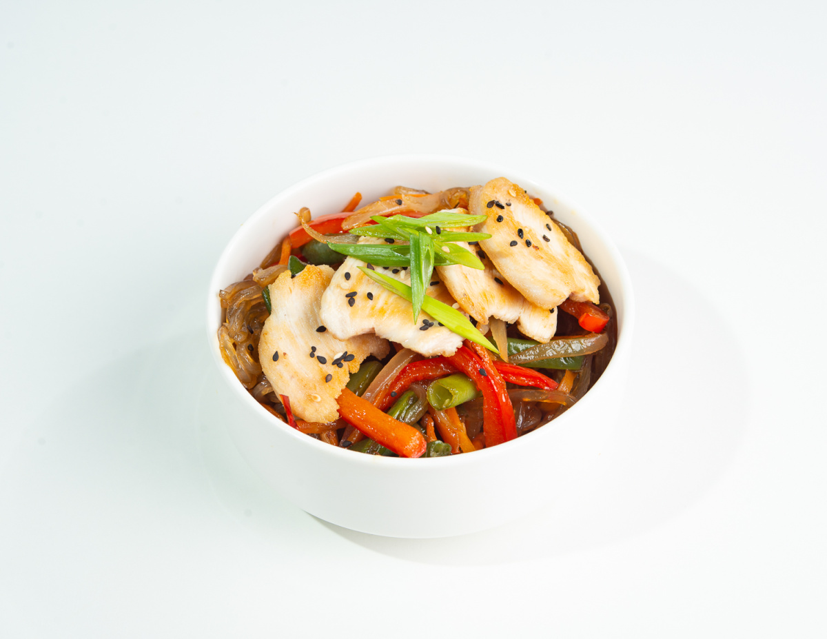 Харусаме лапша, курица, репчатый лук, стручковая фасоль, морковь, болгарский перец, устричный соус, соевый соус, зелёный лук, кунжут