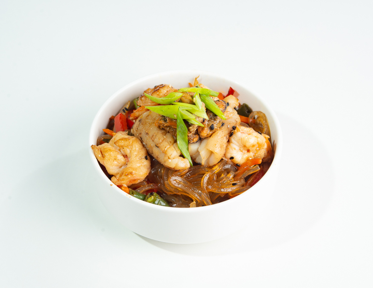 Харусаме лапша, креветки, кальмар, мидии, репчатый лук, морковь, болгарский перец, стручковая фасоль, устричный соус, соевый соус, зелёный лук, кунжут
