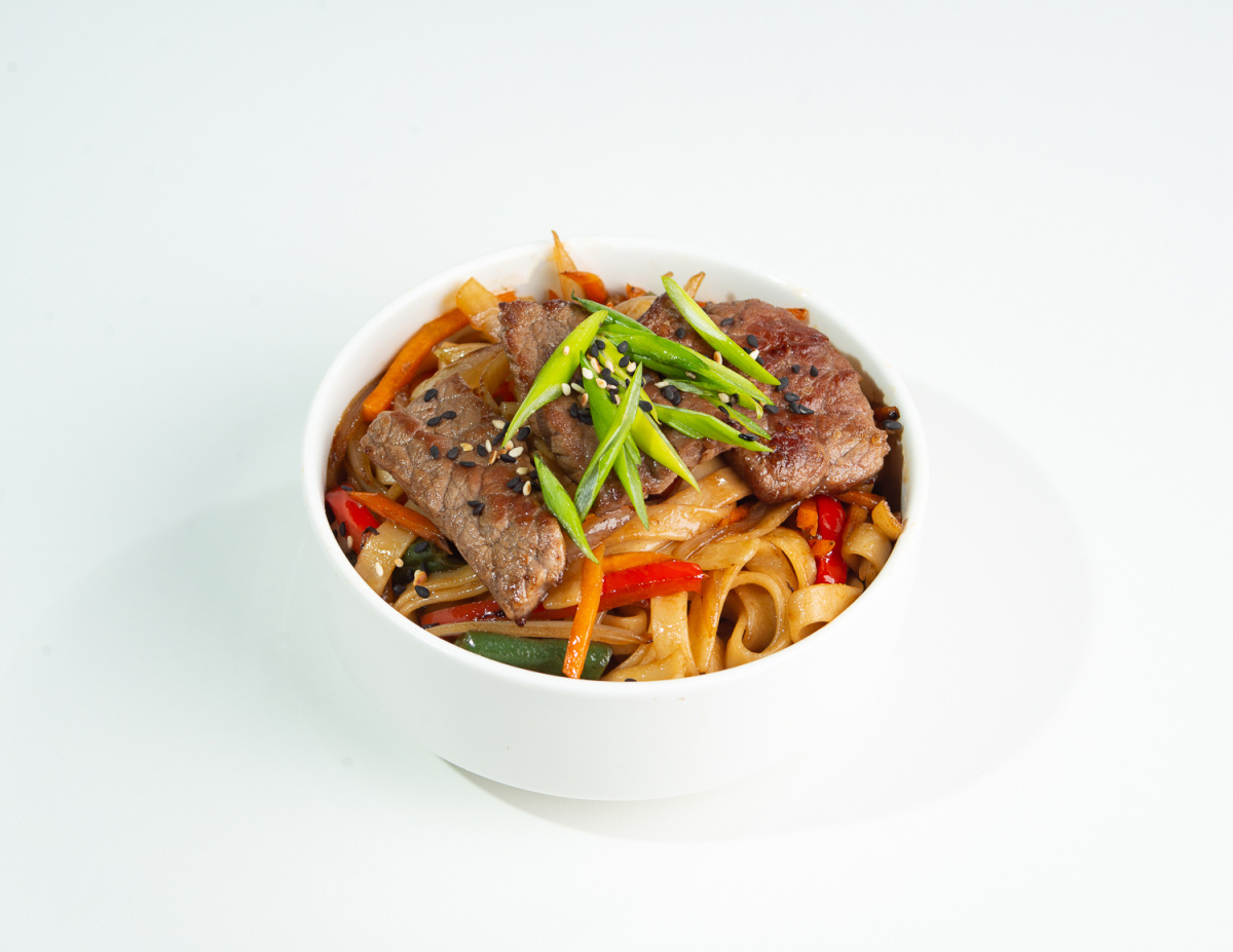Удон лапша, говядина, репчатый лук, стручковая фасоль, морковь, болгарский перец, устричный соус, соевый соус, зелёный лук, кунжут