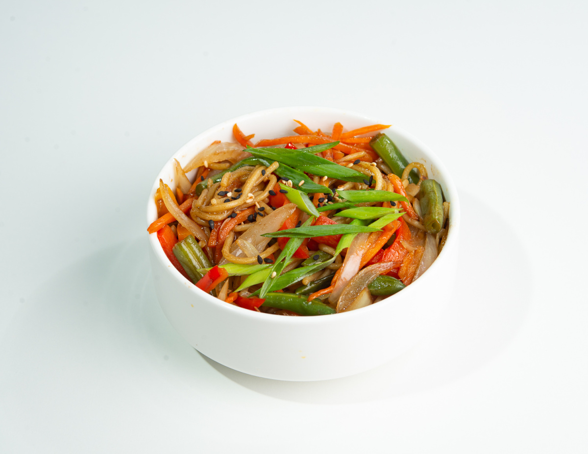 Яичная лапша, лук, морковь, болгарский перец, фасоль стручковая, устричный соус, соус унаги, зелёный лук, кунжут