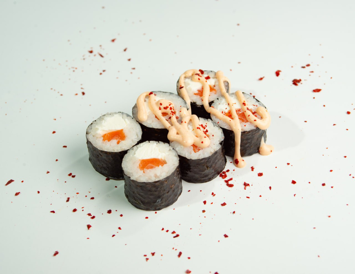 Рис, нори, лосось, творожный сыр, соус спайси, посыпка чили