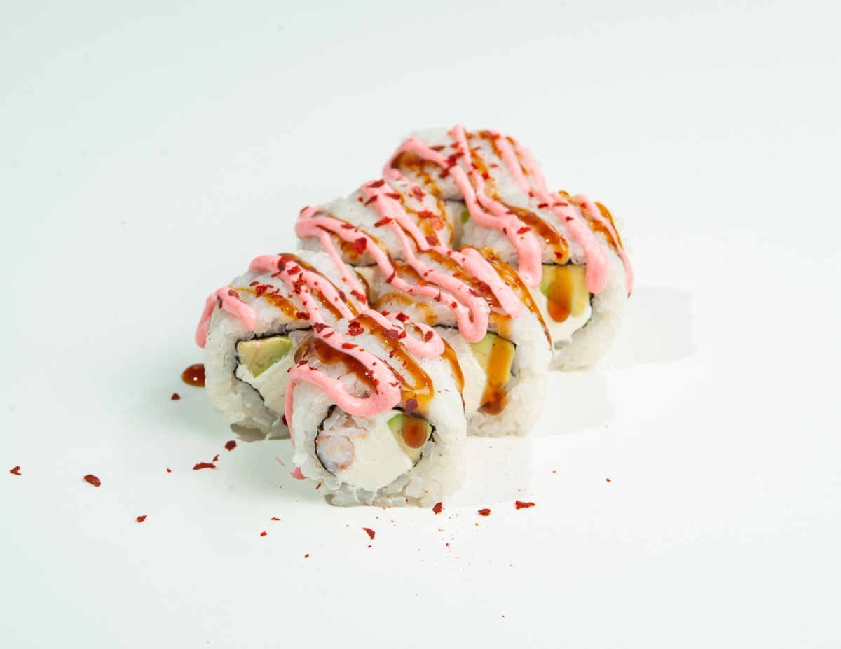 Рис, нори, авокадо, креветки, сыр творожный, соус унаги, соус лава, посыпка чили