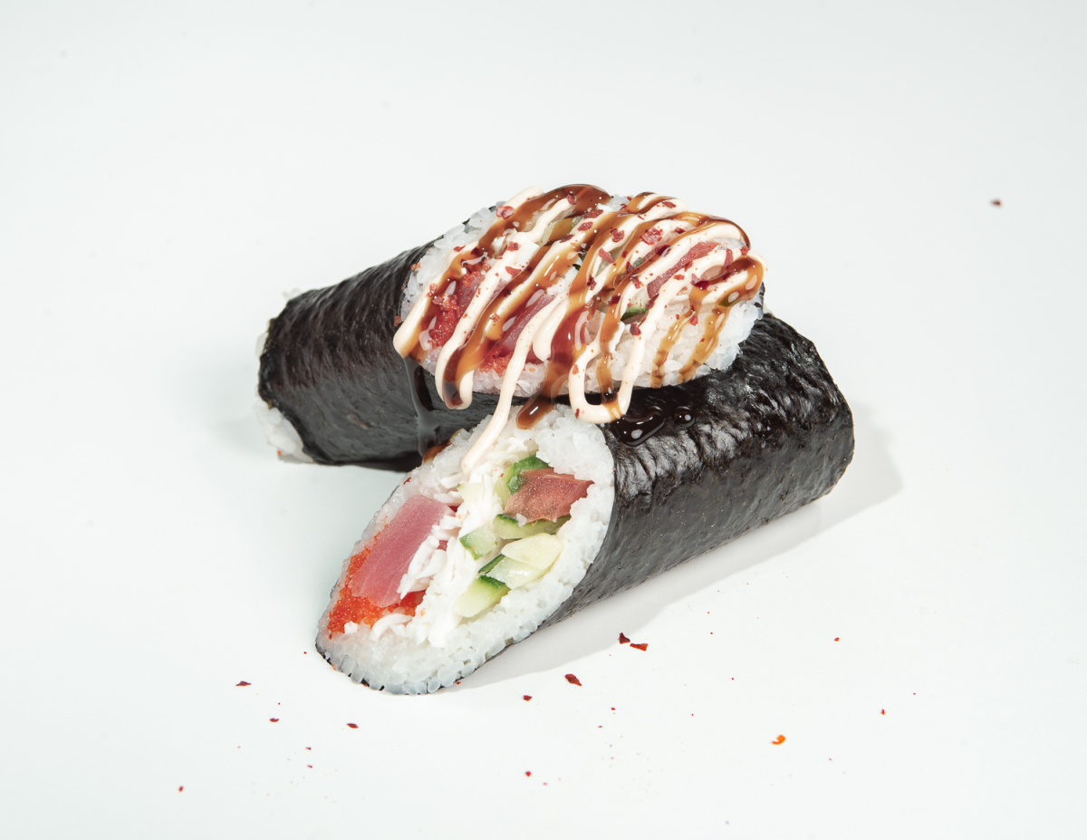 Рис, нори, тунец, огурец, волокна снежного краба, икра тобико, соус спайси, соус унаги, посыпка чили