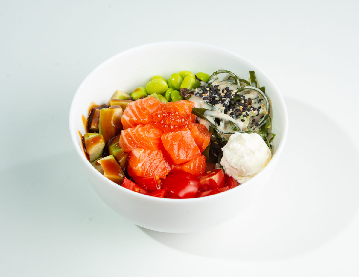 Рис, соус поке, лосось, авокадо, бобы эдамаме, помидоры черри, творожный сыр, водоросли чука, икра лососевая, ореховый соус, соус унаги, кунжут