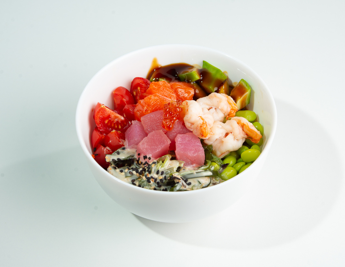 Рис, соус поке, креветка, лосось, тунец, авокадо, бобы эдамаме, помидоры черри, творожный сыр, водоросли чука, ореховый соус, соус унаги, кунжут, икра лососевая