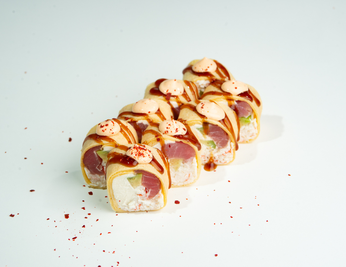Блин тамаго, творожный сыр, тунец, авокадо, волокна снежного краба, соус унаги, соус спайси, посыпка чили