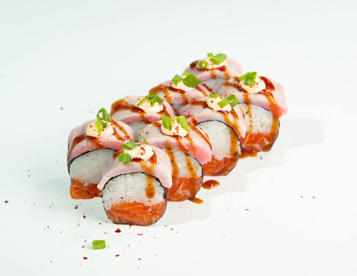 Рис, нори, лосось, тунец, соус унаги, соус спайси, зелёный лук, посыпка чили