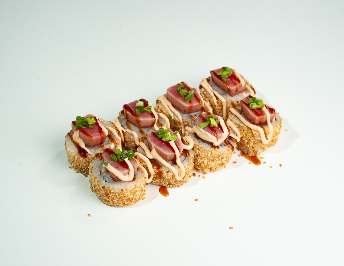 Рис, нори, творожный сыр, огурец, японский омлет, кунжут, тунец, соус спайси, соус унаги, зелёный лук