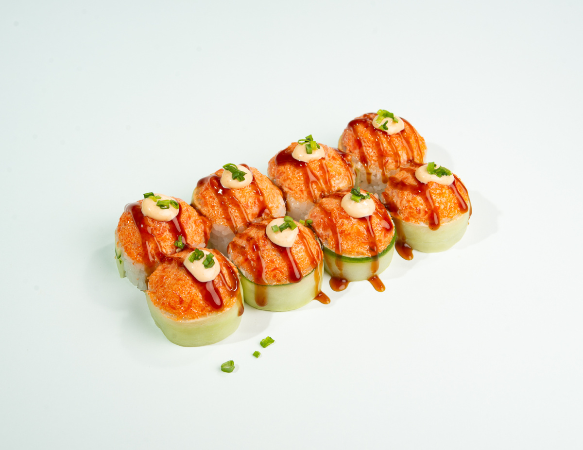 Рис, нори, творожный сыр, японский омлет, огурец, шапка: замес лосось, соус спайси, икра тобико, соус унаги, соус спайси, зелёный лук