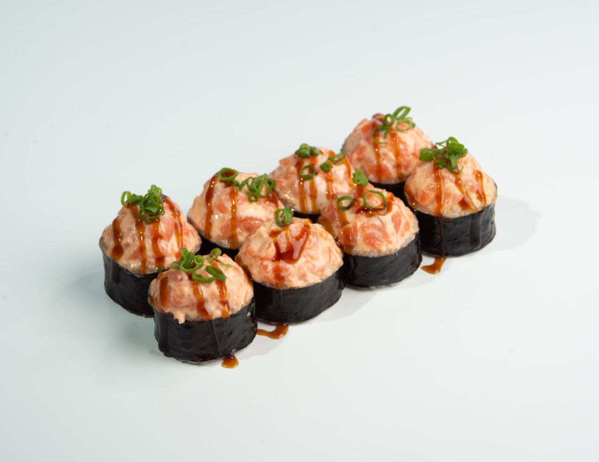 Рис, сыр творожный, нори, огурец, шапка: копчёный лосось, соус спайси, соус унаги, зелёный лук