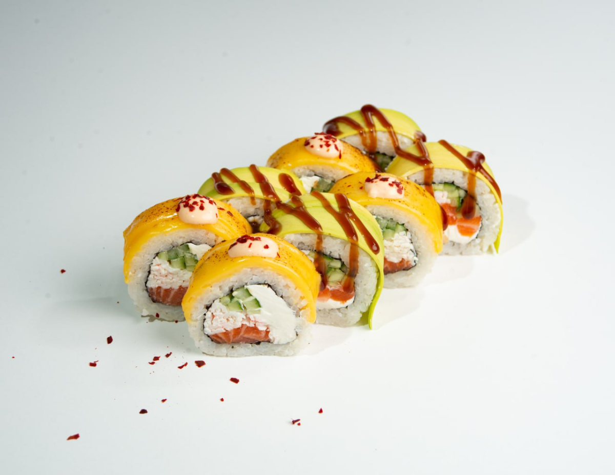 - 6.Сборка 4 на 4 в авокадо и чеддере: сыр лосось, огурец, унаги